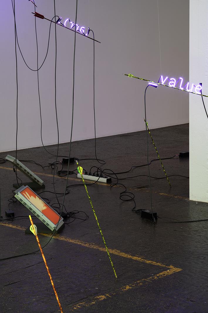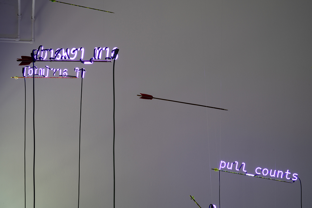 The neon lines are made from fragments of algorithmic codes, pulled from systems that influence how behaviour. They’re stripped from their original function and recast as something between enchantment and command — launched outward like spells, through arrows, through space. It’s not about mysticism or tech hype — it’s about how both spell and script rely on belief systems: belief in causality, in unseen systems, in outcomes triggered by the right sequence of functional words. From a language perspective, it’s a shift from talking about something to making something happen. That collapse of syntax into function — command over communication — is like magic.